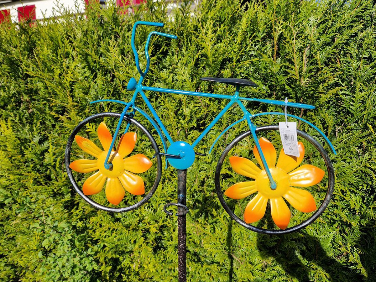 Dieses fröhliche Windrad Fahrrad bunt in Form eines Fahrrads ist ein echter Hingucker für Garten, Terrasse oder Balkon. Der Rahmen ist in leuchtendem Blau gestaltet, während die beiden Windräder als große gelbe Blumen mit orangefarbenen Akzenten gearbeitet sind. Sobald der Wind weht, drehen sich die Räder und erzeugen einen verspielten, farbenfrohen Effekt.