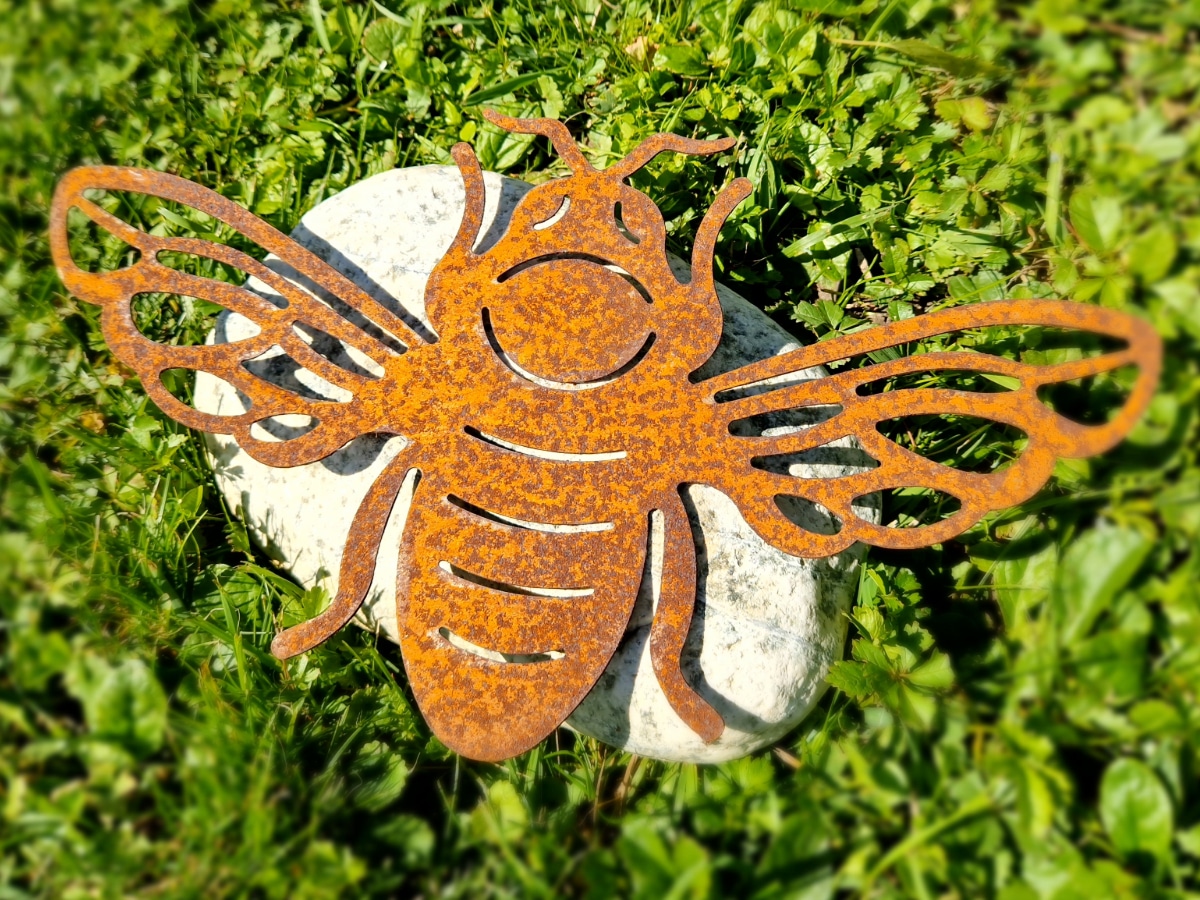 Die Biene ist flach gearbeitet und mit detailreichen Flügeln gestaltet, die ihr ein lebendiges Aussehen verleihen. Das warme Rostfinish entwickelt mit der Zeit eine noch natürlichere Patina, wodurch jede Biene ein Unikat wird.