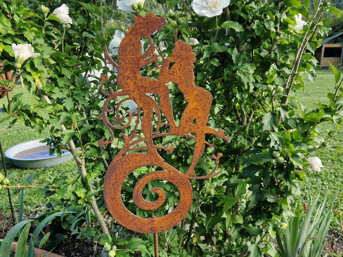 Ob als Dekoration für Musiker, Romantiker oder naturverbundene Menschen – dieser Gartenstecker Nymphenpaar Rost 110cm erzählt eine gefühlvolle Geschichte und wird zum besonderen Blickfang in Blumenbeeten, Rasenflächen oder nahe einer Terrasse.
