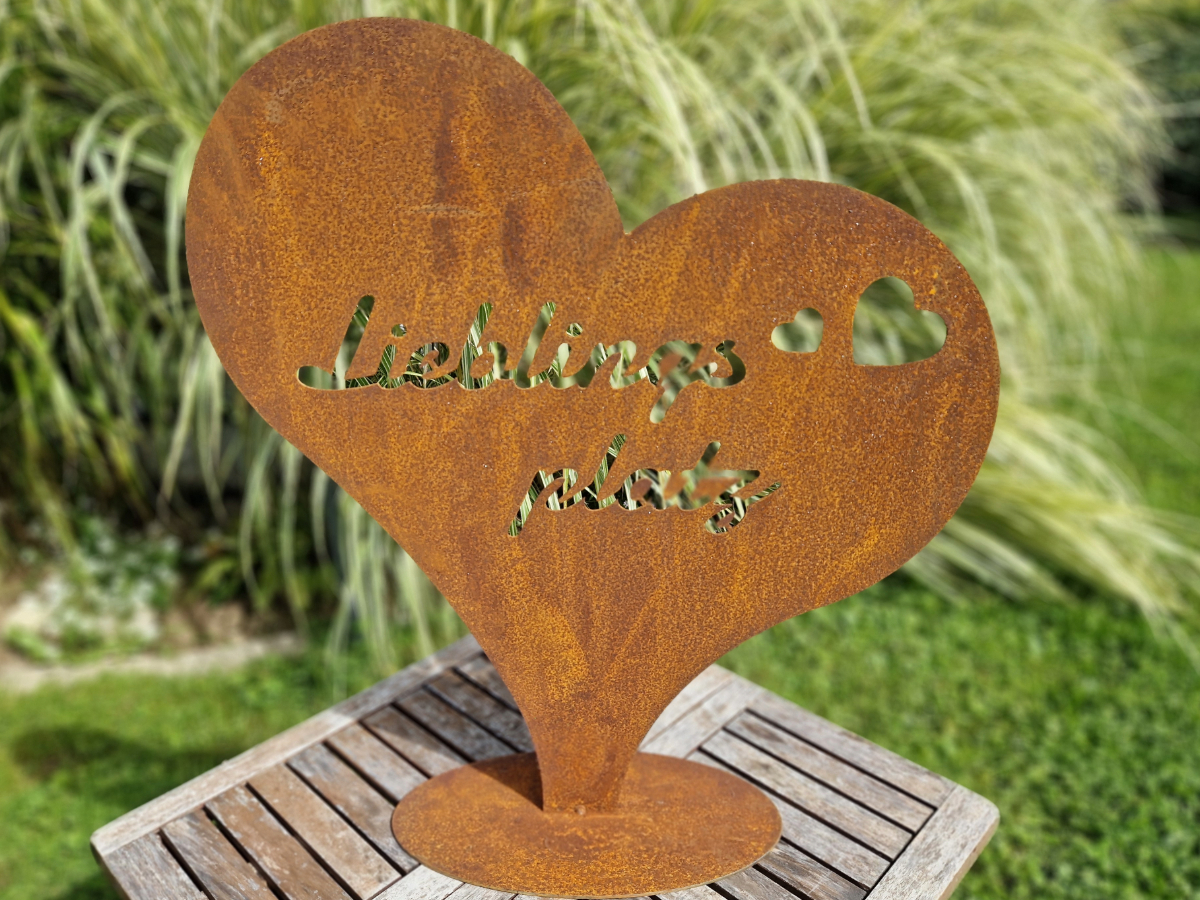 Die wundervoll geschwungene Herzform trägt die Inschrift „Lieblingsplatz“, dazu sind auf der rechten Seite zwei Herzen in verschiedenen Grössen eingestanzt. Das romantische Herz wirkt sehr edel und diskret.