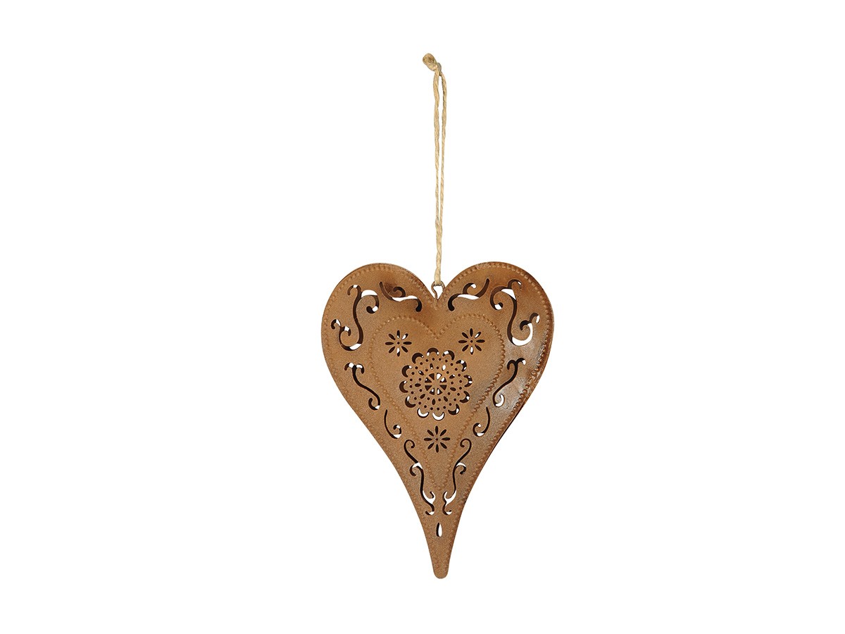 Das Metallherz ist 15 cm hoch und mit einer praktischen Kordel ausgestattet, sodass es sich leicht an Türen, Fenstergriffen, Zweigen, Kränzen oder Laternen aufhängen lässt. Durch das Rostfinish entsteht eine lebendige Patina, die mit der Zeit noch mehr Charakter entwickelt.