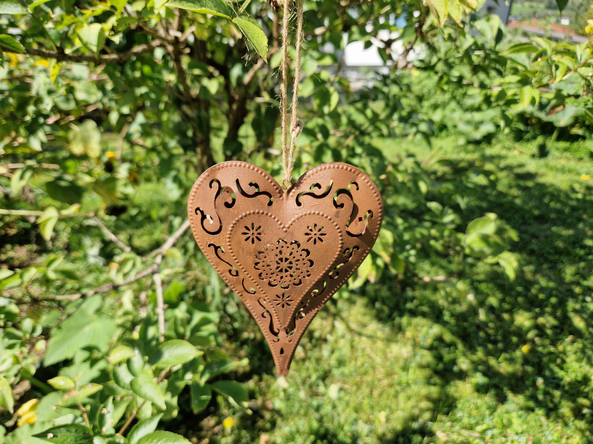 Dieses Herz zum Hängen in Rostoptik begeistert durch seine filigranen Ornamente und die detailreiche Verarbeitung. Mit seinen liebevollen Ausschnitten wirkt es besonders edel und schafft eine warme, stimmungsvolle Atmosphäre – ob im Garten, auf der Terrasse oder im Wohnbereich.