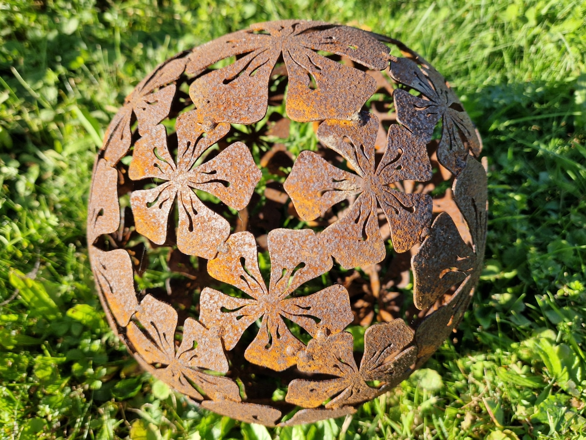 Die kunstvoll ausgeschnittenen Blüten sorgen für ein harmonisches Design und lassen die Kugel, je nach Lichteinfall, spannende Schattenspiele auf dem Boden oder den umliegenden Flächen entstehen. Durch den warmen Rostton fügt sie sich perfekt in die Natur ein und unterstreicht den Charakter einer modernen und zugleich romantischen Gartendeko.