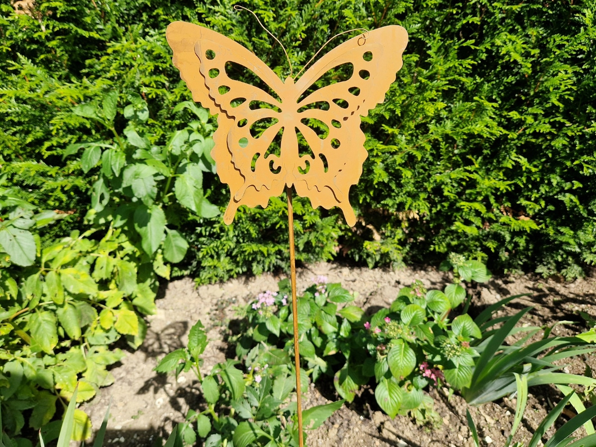 Der Schmetterling Gartenstecker 117cm ist wetterfest und passt überall hin. Durch seine Grösse von 23 x 21cm und seine Höhe kann er aus vielen Pflanzen herausragen und ist gut zu sehen.